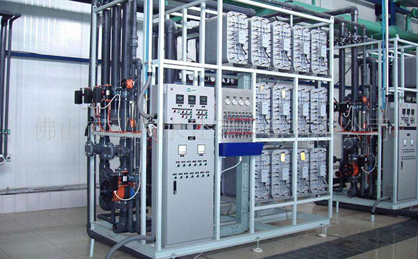 (3)電化學再生過程。利用電滲析的極化過程產生的H+和OH-及樹脂本身的水解作用對樹脂進行電化再生。在EDI電去離子過程中,水中離子首先因交換作用吸附于樹脂顆粒上,再在電場作用下經由樹脂顆粒構成的“離子傳輸通道”遷移到離子交換膜表面并透過離子交換膜進入濃室,在樹脂、膜與水相接觸的介面擴散層中的極化使水解離為H+和OH-,它們除部分參與負載電流外,大多數又對樹脂起到再生作用,在淡水室流道內,陰、陽離子交換樹脂因可交換離子不同,有多種存在形態(tài),如R2Ca, R2 Mg, RNa, RH、R2 Sq、RCl、RHC03、ROH等,離子交換樹脂的再生是在電場作用下離子遷移及進水中離子共同完成的。從而使離子交換、離子遷移、電再生三個過程相伴發(fā)生、相互促進,達到了連續(xù)的去離子過程。高純度的淡水連續(xù)從淡水室流出,從而實現水的深度脫鹽過程。