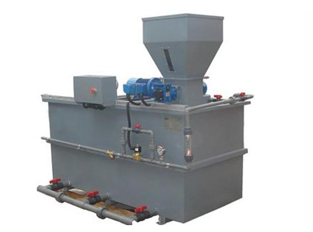 聚合物溶液制備過程是通過各個溶液箱分級逐步處理完成的.溶液箱之間隔開。保證每個溶液箱內的最佳反應時間和恒定的濃度.避免在預制箱和最終溶液箱之間產生任何直接通路。該設備由控制箱自動控制.此控制箱與安裝在最終溶液箱上的液位計相連.一旦液位達到“低位”,觸發電動進水閥打開。觸點式流量計就啟動干投機.干投量的大小按照水量而定,以獲取精確的濃度,一旦達到“高位”此循環過程就停止。當然兩(或三個)攬拌器還在工作。該設備還用于將乳膠狀的陽離子、陰離子或無離子型的聚合物連續自動的制成標準稀釋濃度(0.3-5g/L)的溶液。盡管一般認為乳膠狀的聚合物制成標準溶液所需的熟化時間大大少于粉粒狀聚合物,但是在將藥耗達到最佳狀態過程中總是推薦要充分的熟化時間。